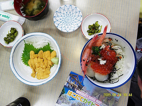 In函館Hakodate, sashimi are very famous because Hakodate locates near the sea. So the seafood is really fresh. おいしね!